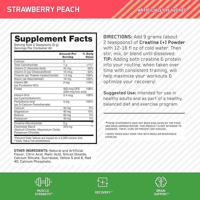 Optimum Nutrition Creatine Monohydrate Plus Powder, Strawberry Peach Flavored Creatine Performance Blend, with Electrolytes for Hydration, Added Vitamins, 40 Servings, 360 Grams (Packaging May Vary)