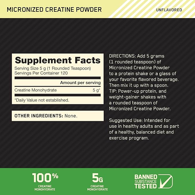 Optimum Nutrition Micronized Creatine Monohydrate Powder, Unflavored, 120 Servings, 600 Grams (Packaging May Vary)